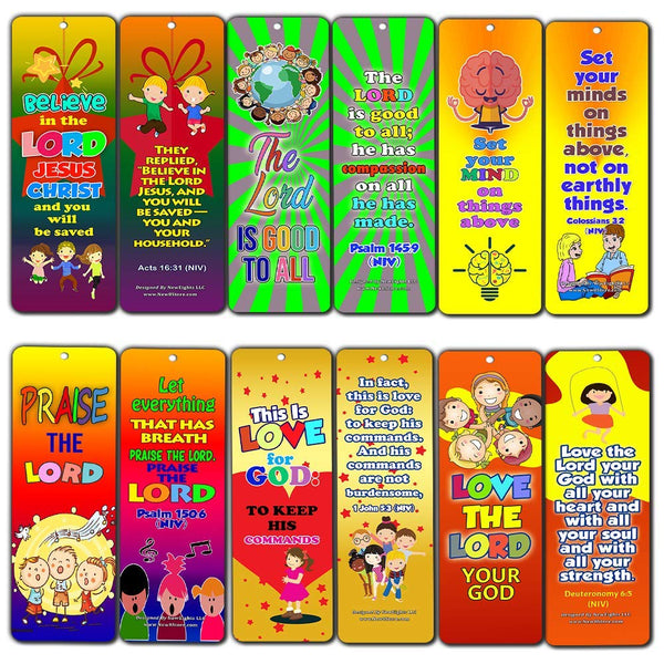 - GREAT MEMORY VERSES FOR KIDS BOOKMARKS (12-Pack) - 6 unique designed bookmarks x 2 pcs each design. Designs come with bible texts: Acts 16:31, Psalm 145:9, Colossians 3:2, Psalm 150:6, 1 John 5:3, Deuteronomy 6:5.