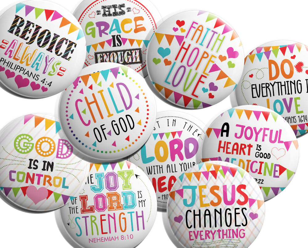 NewEights Christian Pinback Buttons for Kids - Rejoice Always (10Pack)