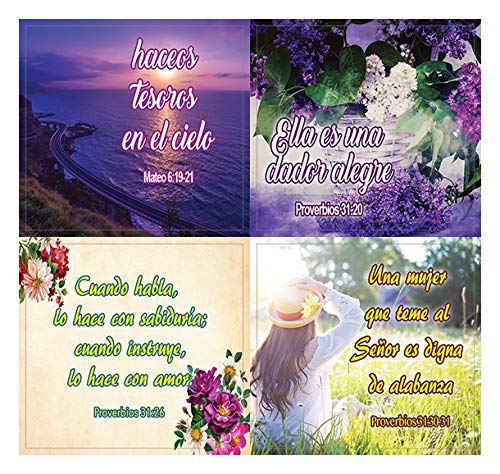 Encouraging Religious Stickers - Spanish Christian Stickers for Women Series (20 Sheets) Se una mujer piadosa Proverbios 31:25 Soy Hermoso Cantares 4:7 El secreto de la belleza es tener a Dios es tu corazón El corazón alegre hermosea el rostro 1 Pedro 3:3-4 Una mujer virtuosa, es mucho más preciosa (valiosa) que las joyas Salmos 46:5 Una mujer sabia edifica su casa Proverbios 14:1 Ella es más preciosa que los rubíes Proverbios 31:10 Se reviste de fuerza y dignidad Proverbios 31:25 haceos tesoros en el cielo Mateo 6:19-21 Ella es una dador alegre Proverbios 31:20 Una mujer que teme al Señor es digna de alabanza Proverbios 31:30-31