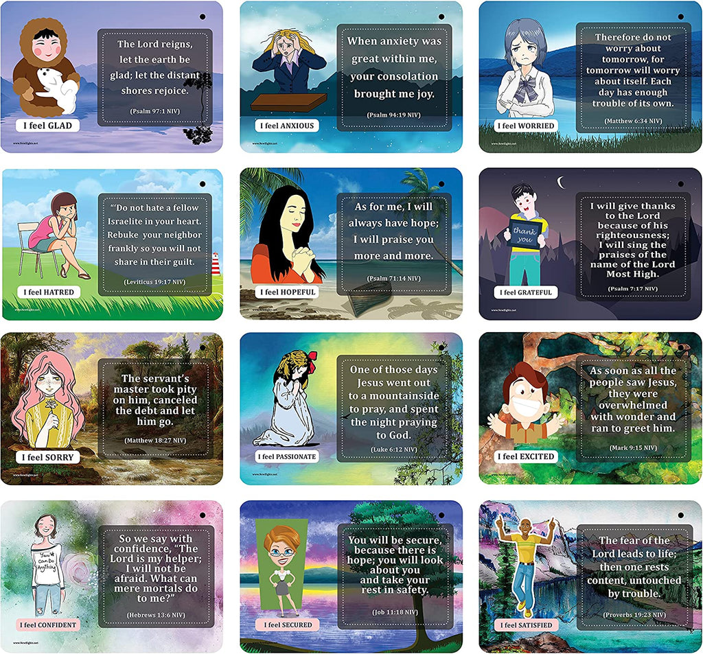 Bible Emotions Fun Facts Learning Cards (3 Set x 12 Cards) COLORFUL AND GREAT ASSORTMENT OF ENCOURAGING POSTCARDS