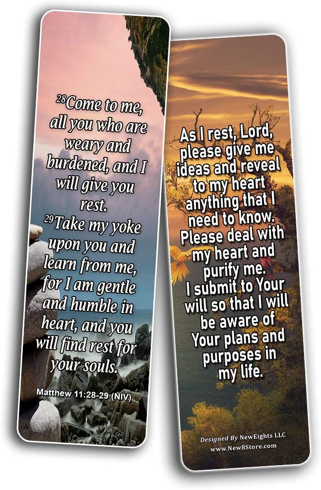 - BOOKMARKS WITH UNIQUE DESIGNS & PRINTED ON BOTH SIDES. Front and back of the bookmark displays the quoted biblical texts that are designed to encourage and to uplift the user. Highlights of the content are: Matthew 6:34, Psalm 4:8, Proverbs 3:24, Psalm 3:5, Psalm 127:2 and Matthew 11:28-29. This is the best way to inspire people.
