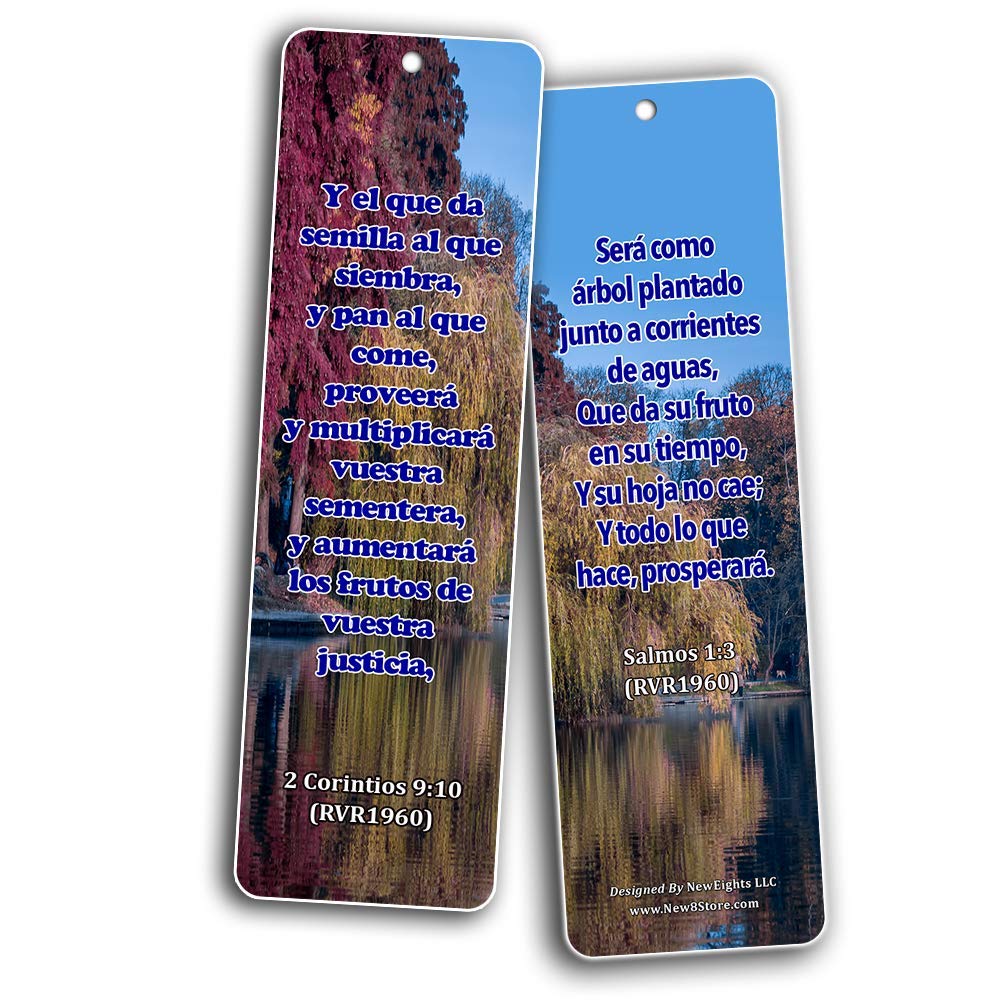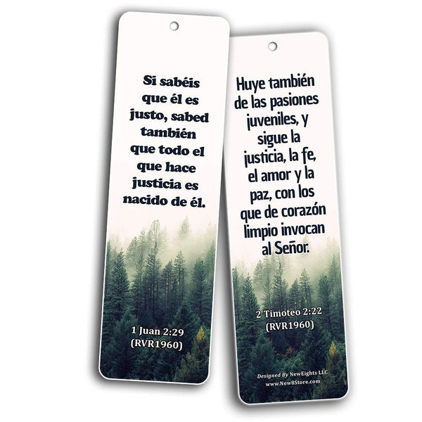 - SPANISH BIBLE SCRIPTURES ABOUT RIGHTEOUSNESS (12 PACK) - 6 unique designed bookmarks x 2 pcs each design. Designs include Spanish inspirational bible texts: 2 Corintios 9:10, Salmos 1: 3, 1 Pedro 2:24, Filipenses 1:11, 1 Juan 2:29, 2 Timoteo 2:22, Proverbios 12:28, Génesis 2:17, Malaquías 4: 2, Proverbios 13: 6, Proverbios 11:30, Isaías 33: 15-16. Easter Day Basket Stuffers